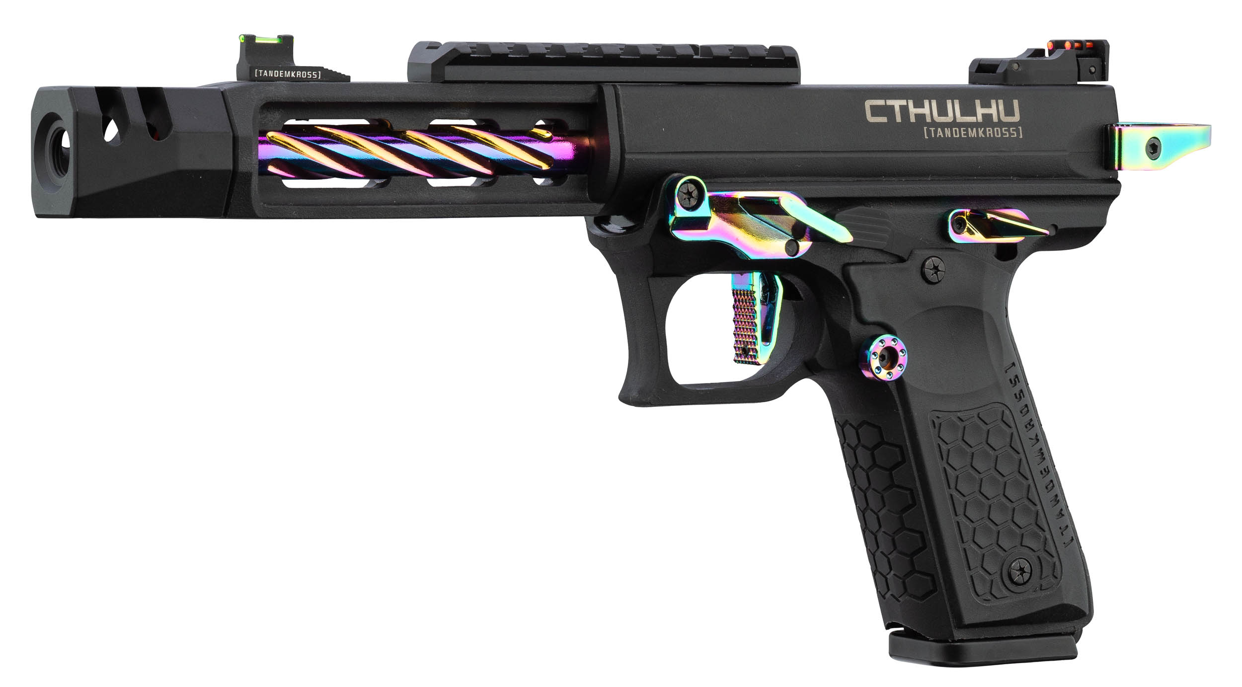 Découvrez le nouveau pistolet à gaz Tandemkross CTHULHU en noir/rouge. Fabriqué en polymère renforcé, ce GBB semi/full auto bénéficie d'un design entièrement sous licence. Cette réplique est doté d'un compensateur carré innovant "Game Changer Pro", d'un repose-pouce CNC, et d'une détente "squelette". De plus le Tandemkross Hivegrip assure une prise en main solide. Avec un anneau de chargement "Halo" et des viseurs à fibre optique "Eagle Eye", ce pistolet offre une précision inégalée. Le chargeur de 24 coups et le hop-up réglable renforce sa polyvalence.