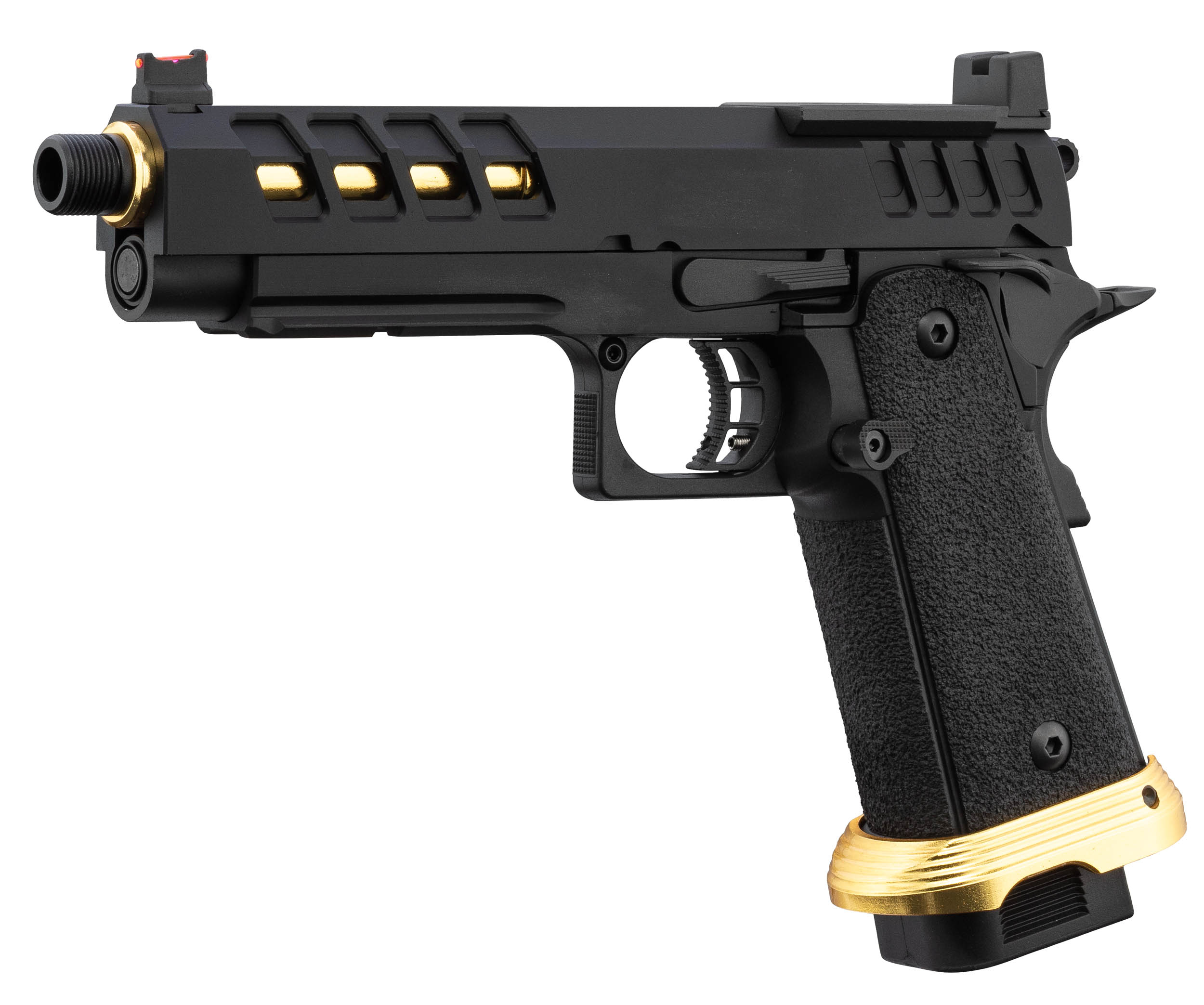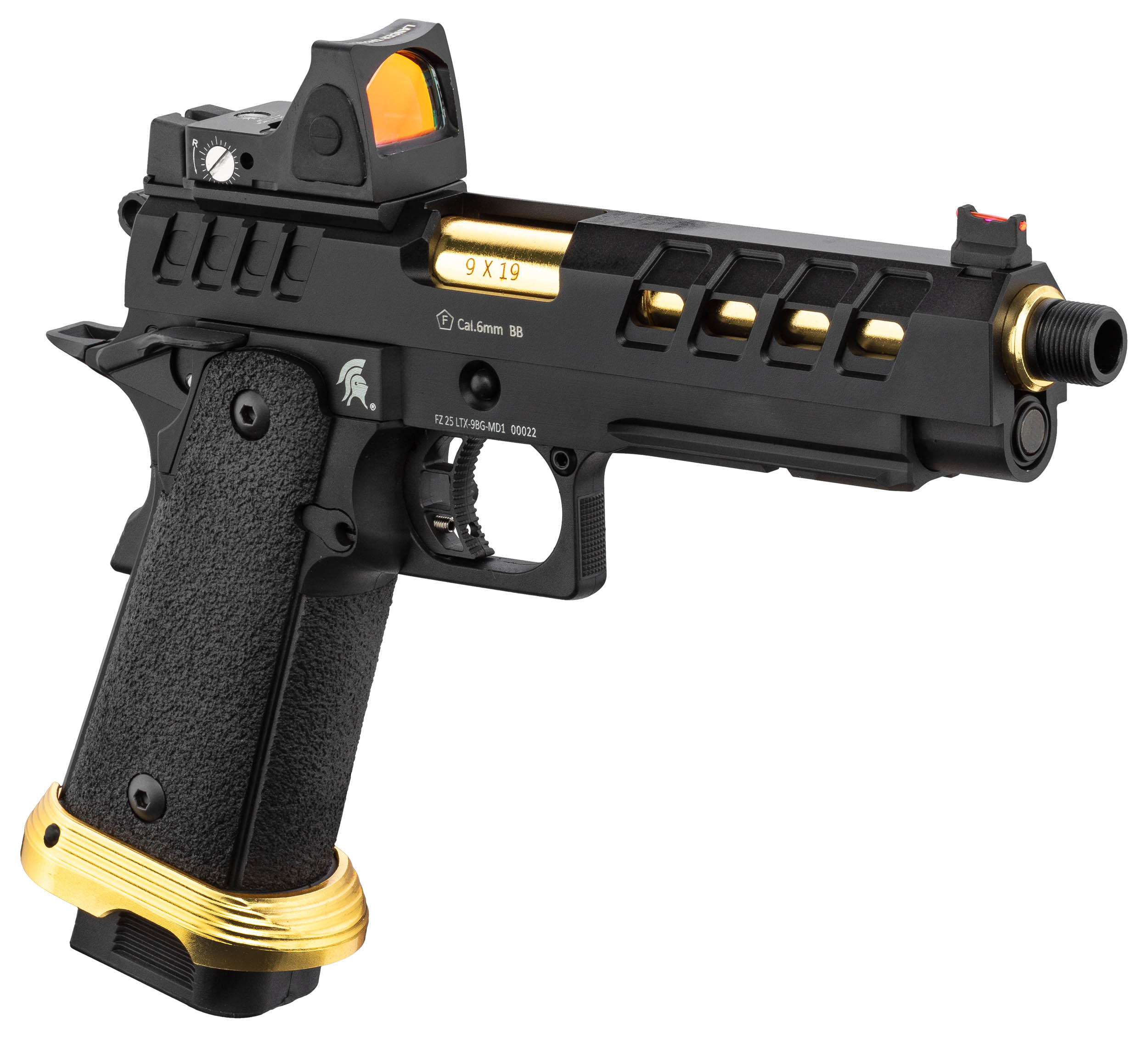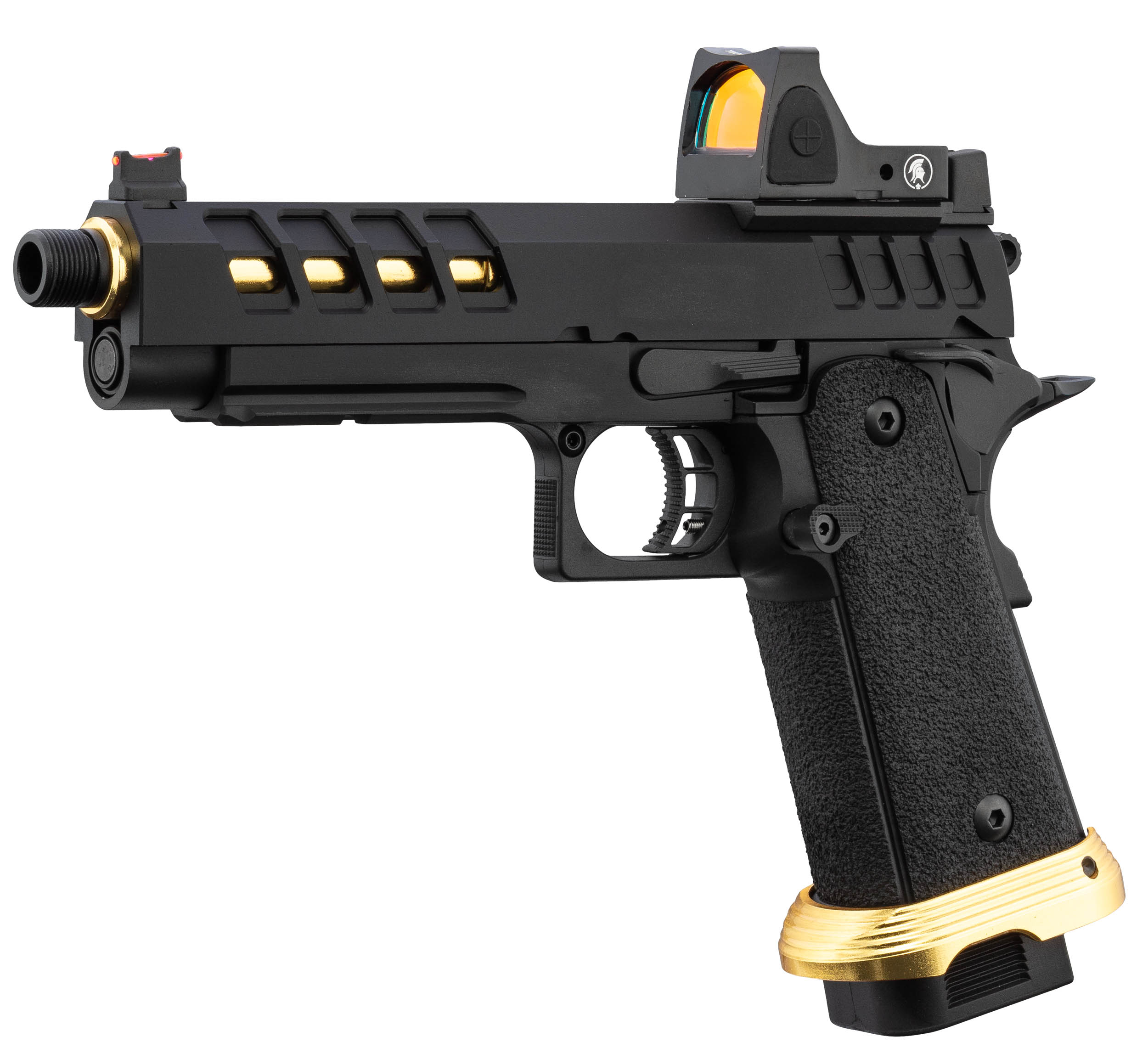 Réf. PG9016 | Désignation Pistolet Airsoft GBB HERACLES Hi-Capa 5.1 Noir/Gold avec RMR Lancer Tactical | Catégorie légale Vente libre | Coups 28 | Longueur (cm) 24 | Poids (g) 1030 | Type Airsoft Gaz |